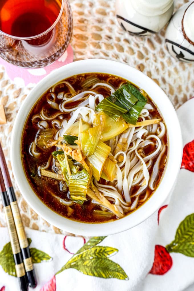 A wonderful thing happens when you mix garlic and ginger with a savory broth. This fragrant rice noodle soup has a deep umami flavor from broth (perfumed by dried shiitake mushrooms) that permeates both the noodles and the bok choy. I use baby bok choy for its pliant crunch. This is my go-to Asian noodle soup in the summertime.