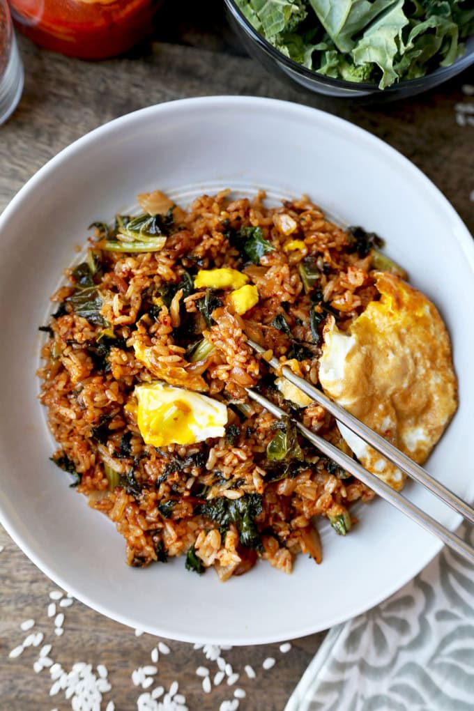 If you think fried rice sometimes comes across as a little meek in the flavor department, this will obliterate that notion. Kimchi bokkeumbap (๊น์น ๋ณถ์๋ฐฅ), is a popular Korean dish made of leftover rice pan fried with kimchi. Then a mixture of soy sauce, gochujang (Korean chili paste) or gochugaru (Korean pepper flakes) brings umami and heat. Most fried rice recipes call for scrambled egg. However, for this one, I find a fried egg with a runny yolk provides the perfect creamy counterpoint to the otherwise aggressive flavors.