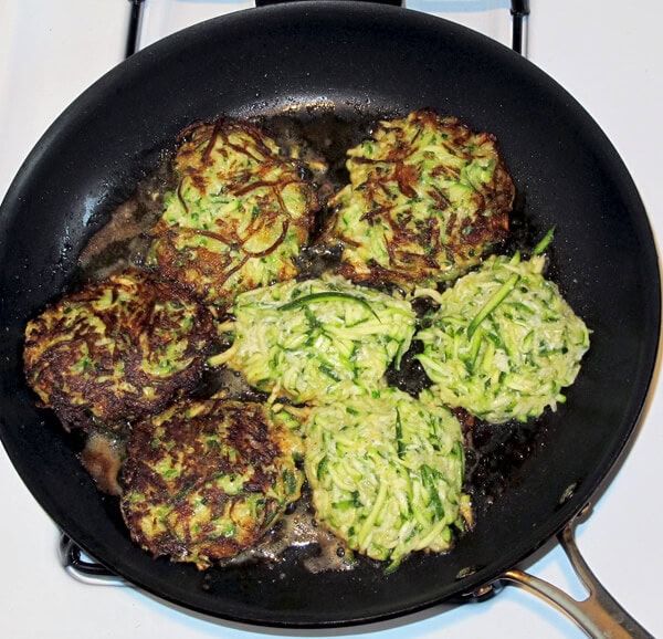 Tomato sauce is optional since the cakes are very tasty on their own, but I personally like it for extra zing, color and character. These zucchini cakes will keep in the fridge for a couple days (separately from the sauce, to avoid sogginess.)