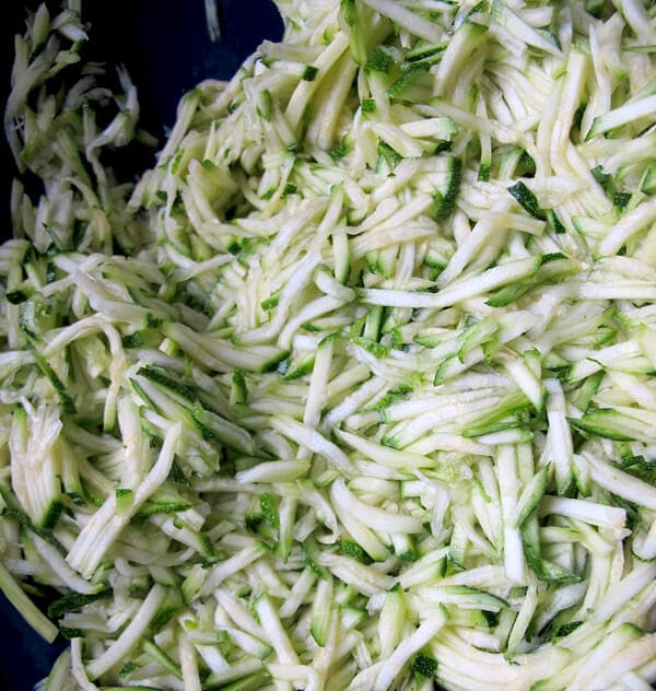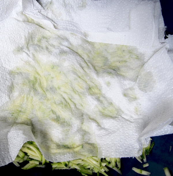 - In a large mixing bowl, squeeze out the excess water from grated zucchini by using paper towel or a cheese cloth. Repeat this step a few times until paper towel doesn’t easily soak anymore.
